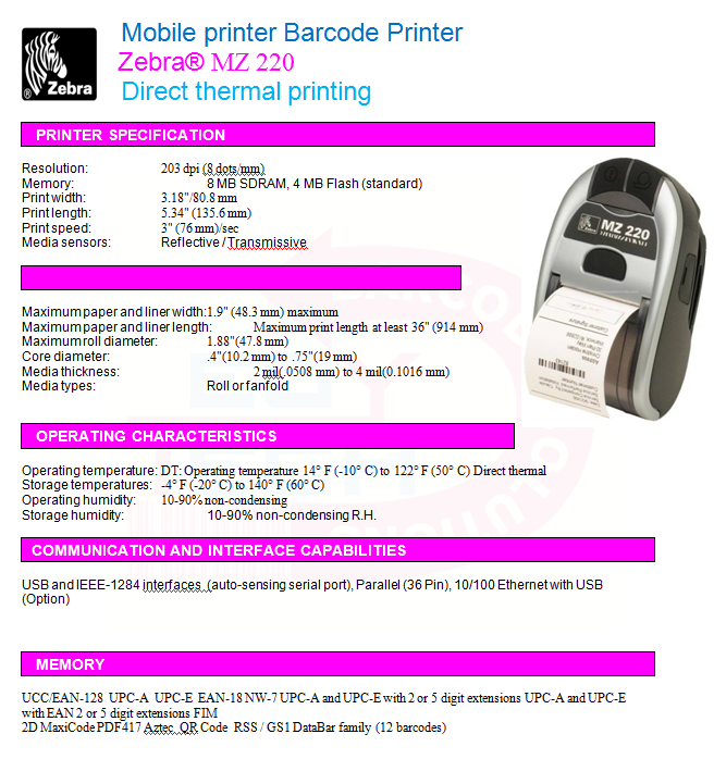Zebra® MZ 220 فبراير 15, 2015 admin Direct thermal printing, Mobile printer Barcode Printer, Zebra Mobile printer Barcode Printer Zebra® MZ 220 Direct thermal printing